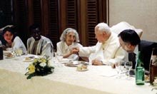 desalinhados e rosto enrugado, que comeu ao lado do papa,